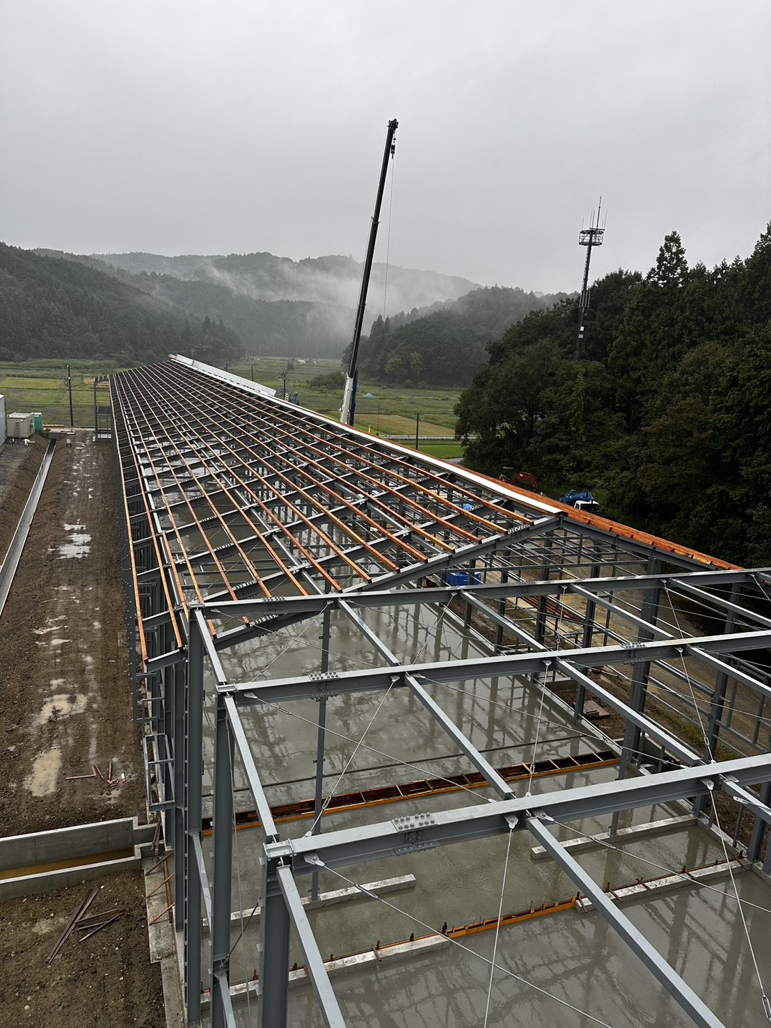 雨天時には写真にもあるように一面に霧が立ち込め、自然と隣り合わせの環境の中で、鉄骨の光沢と職人たちの動きが静かに映えます。
